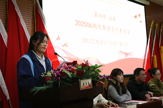 仪式第四项议程,2412 班董子晴同学作为优秀学员代表发言,她分享了自己在团校学习中的心得与感悟,言语间满是对团的热爱与对未来的期许,也引发了在场学员的强烈共鸣。