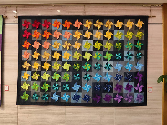 作品《等风来》以拼布艺术为媒介,通过渐变色布料的巧妙裁剪与拼接,构筑出一组立体旋转的风车阵列。由深入浅的色调过渡,暗喻时光流转与乡村生活的诗意变迁。当微风轻拂,布面随风起伏,形成独特的动态视觉效果,仿佛风车正悠然转动,静候美好生活的佳音。每一片风车叶皆由学员亲手缝制,针线间承载着居民对幸福生活的期盼与信心,传递出“等风来,即是等希望”的温暖主题。