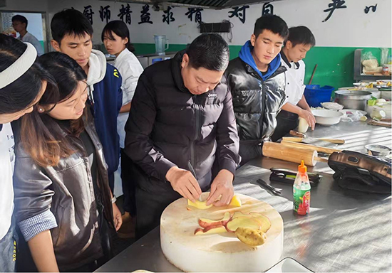 宁波市甬江职业高级中学周伟忠为学生示范土豆雕刻操作
