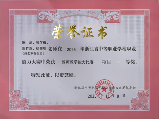 捷报传来,再创辉煌!11月8日,2025年浙江省中等职业学校职业能力大赛教师教学能力比赛在浙江经济职业技术学院落下帷幕。学校陈洁老师团队凭借卓越的综合实力与精彩的现场表现蝉联专业一组一等奖,续写了学校在该项赛事上的新篇章!