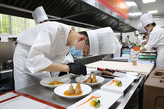 烹饪:通过展示中式热菜、西式点心、果蔬雕刻、冷拼摆盘等多项技艺,既考验学生的基本功底,也强调创新意识与审美素养,通过技能实操与作品介绍全方位展示各自专业素养。