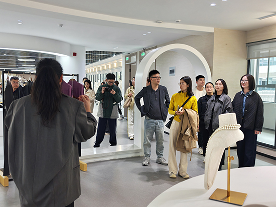研修团队首站抵达温州市瓯海职业中专集团学校,在对方校领导陪同下,参观时尚设计学部服装实训室,实地了解产教融合模式。