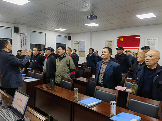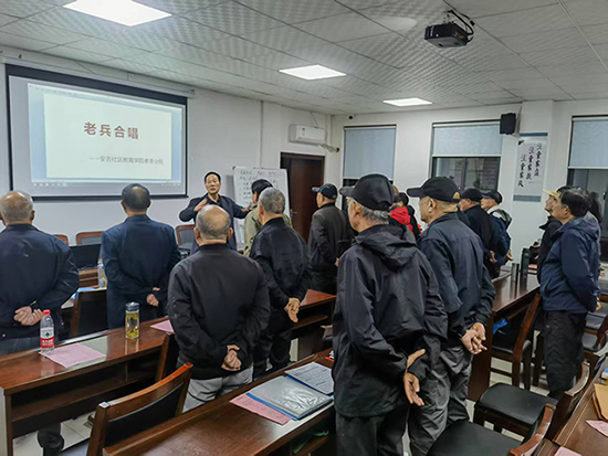 当晚7时,培训正式拉开帷幕。授课教师张鹤鸣刚走上讲台,便被眼前的场景打动:30名老兵自发列队,双脚分开与肩同宽,双手后背相握,跨立的姿态整齐划一,仿佛重回军营时光。“这首歌是咱们老兵的心声,唱的时候要带着对党的忠诚、对军队的热爱!”张老师先详细讲解《人民军队忠于党》的创作背景,从战火纷飞的岁月讲到和平年代的坚守,让老兵们再次感受歌曲里的红色情怀。
