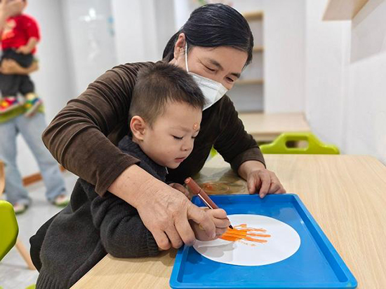 活动现场,老师们早已提前备好橘红、金黄等秋日色调的印泥与画纸,以耐心引导孩子们开启创意手工之旅。孩子们稚嫩的小手蘸取印泥,在纸上轻轻一按,一片片形态各异、色彩鲜活的“秋叶”便跃然纸上;家长们则在旁细心协助,和孩子一起用画笔勾勒细致的叶脉,在画布下方添绘出生机盎然的绿意草地。简单的操作里,孩子们直观感受着秋天的绚烂色彩;亲子协作间,想象力与创造力也在欢声笑语中悄然绽放。