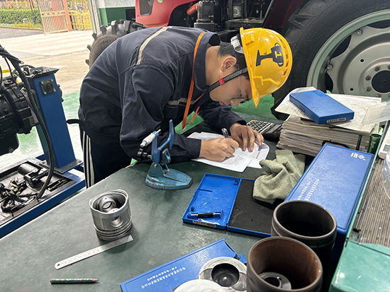 在农机理论测试环节,两人凭借对农机原理、故障诊断等知识的深入掌握,为后续实操环节奠定了坚实基础。进入拖拉机检修项目,他们需在90分钟内完成大型轮式拖拉机悬挂农具作业机组的技术维护、综合故障诊断与排除,以及零件鉴定、部件及总成件检修等内容。面对复杂的拖拉机动力系统、传动系统等模块,两人分工协作,精准排查故障,高效完成维护检修任务,展现了对大型农机设备的娴熟把控能力。