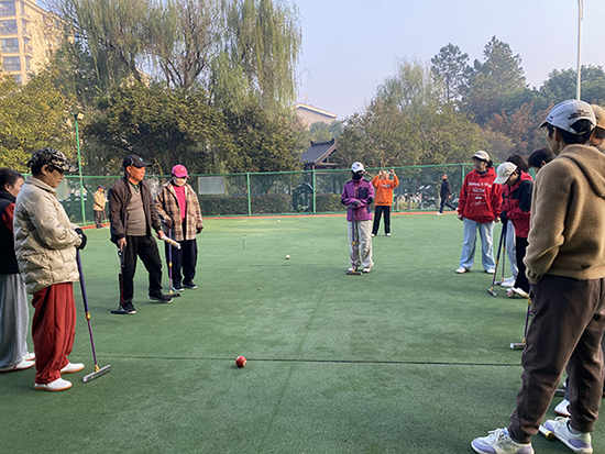 “握杆要稳,瞄准点再发力……” 培训一开始,郭尤华老师就从门球基础动作入手,一边示范握杆、站姿、击球的标准姿势,一边用通俗的语言拆解动作要领。针对学员们初次接触的生疏感,他耐心指导每一个人,发现动作偏差及时纠正,还手把手调整学员的手腕力度和瞄准角度。