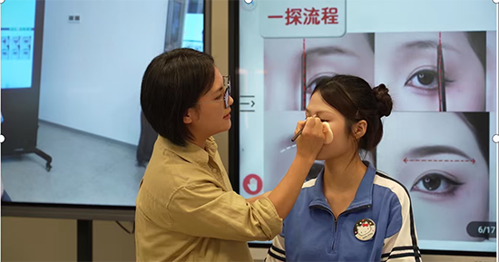 朱丽青老师获奖课程聚焦学生最难掌握的眉形塑造问题,对传统远山眉进行创新改良,形成适配多数模特脸型的中式远山眉设计。课程通过师生共研五字口诀、移动直播车同步示范、妙镜系统实时呈现教学内容等信息化手段高效破解,同时,搭配AR动静态造型游戏激发学习兴趣,而校企合作开发的眉形游标卡尺,则让眉形对称难题有了实用解决方案。独创的“三段五维度六方评价”立体式积分体系,让教学评价及时高效,全方位助力学生提升技能。