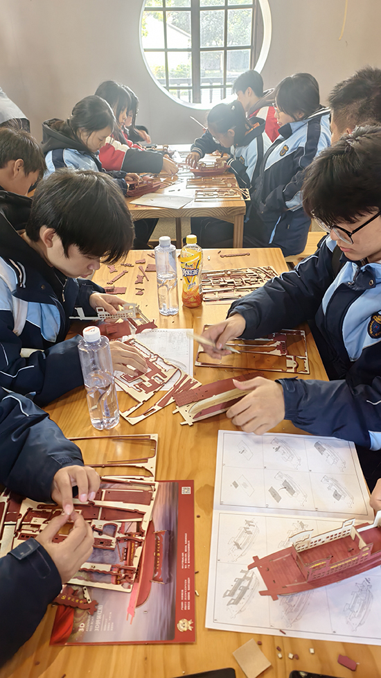 活动还特别设置了“亲手制红船”环节,邀请到省级非物质文化遗产“南湖画舫制作技艺”第四代传承人现场授课。传承人从隋唐时期嘉兴造船业的兴起讲起,梳理了南湖画舫制作技艺的源流与特色,并拆解红船模型的榫卯结构,讲解其“无需胶水、不借助外部工具”的环保制作原理。在传承人与助教的指导下,同学们动手拼装红船模型,互相协作、专注投入,认真完成每一个榫卯的精准对接。通过亲手制作,大家不仅掌握了传统木艺的基本技巧,也体会到匠人严谨细致的精神,更将红船精神以具象的形式铭记于心。