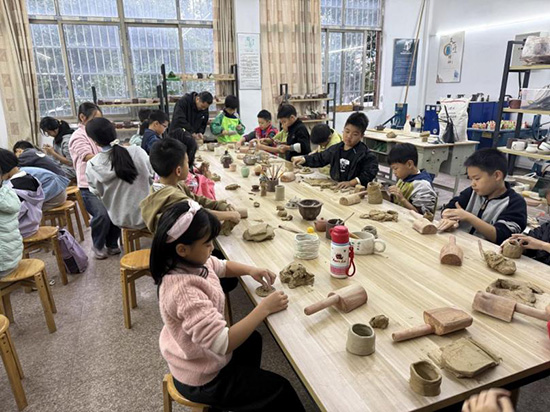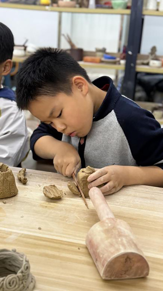 本次托管活动内容丰富,特色鲜明,充分利用了学校的专业优势和资源。在系列活动中,孩子们先后体验了陶艺制作、扎染工艺、竹编艺术以及科创项目等多种特色课程。他们不仅在工艺美术老师的指导下,与泥土对话,感受拉坯塑形的乐趣与匠人精神;也在服装组老师的带领下,亲手扎染制作出独一无二的团扇,领略传统技艺的奇妙。活动还特邀竹编工艺大师斯浙鹏亲临指导,让小朋友们在动手实践中加深对传统文化的认知。此外,科创名师沈亚东老师和创客团队的同学们为小朋友们开启了一场“科创巡游”,引领孩子们走进科技的世界,感受智能制造、电脑编程和AI机器人的无限魅力,激发了他们的探索与创新热情。系列活动的收官之作“操场长卷拓画”,则让孩子们在阳光下用树叶和日常物品挥洒创意,长长的画布上,拓印的不仅是树叶的形状,更是孩子们对这个秋天最鲜活的记忆,为秋假画上了圆满的句号。