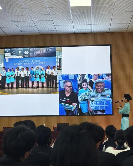 在互动环节,同学们围绕“如何提升学业水平”“高压环境下的情绪管理”“民航业发展趋势”等问题踊跃提问。徐雨桐耐心解答,并鼓励学弟学妹在校期间扎实专业基础、强化英语应用与应急处置能力,同时注重综合素质培养,以积极心态迎接未来挑战。她表示,母校的培养是她职业道路上的坚实基石,希望以此次分享为契机,为母校人才培养贡献一份力量,也期待更多学子未来成长为航空服务领域的中坚力量。
