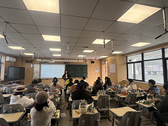 培训中,章战红老师从插花的历史文化、花材分类、工具使用等基础知识入手,逐步深入到色彩搭配、空间构图、意境营造等专业技巧。她通过现场演示与互动指导相结合的方式,生动讲解了如何通过花艺表达自然之美与艺术韵律,并鼓励教师们动手实践,创作独具个人风格的作品。活动现场花香四溢,气氛热烈,教师们沉浸其中,在剪插搭配间感受美、创造美。
