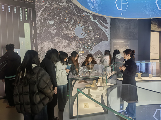 随后,队伍移步至“茅山遗址展厅”。该展厅集中展示了与良渚文化密切相关的珍贵遗存。面对一件件古朴精美的陶器、玉器,同学们驻足细观,认真聆听先民们的生产方式、社会组织与精神信仰,仿佛跨越千年,与古老文明展开了一场无声却深情的交流。