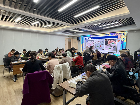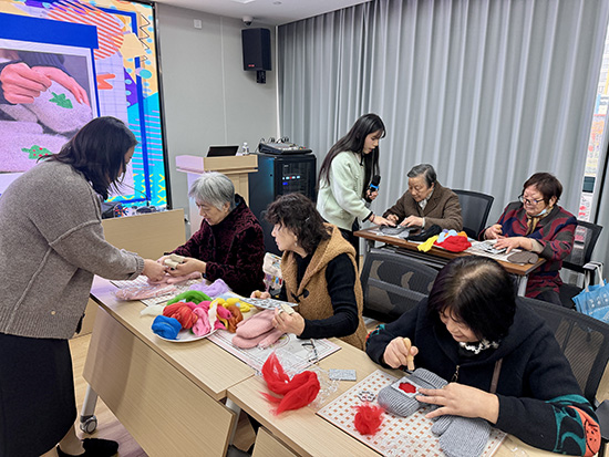 “阿姨们,要先抓出大概的羊毛量,再慢慢将羊毛用戳针戳刺出第一个造型,别一下子拿出太多,之后可以再拿一些羊毛继续塑形,但大家要注意安全,带上保护手指套,不要扎到手哦!”工作人员一边巡视指导,一边反复叮嘱安全事项,耐心解答老人们遇到的问题。