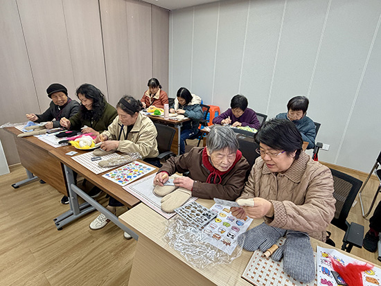 活动现场暖意融融,来自沐元职业培训的范老师早已备好各色羊毛、图案模板和戳针等材料。“今天带阿姨们做一双超可爱的毛茸茸的羊毛毡手套,俗称‘戳戳乐’”随着范老师热情的讲解,大家迅速投入创作,在场的老人们纷纷挑选自己喜爱的羊毛颜色,小心翼翼地将羊毛扯散、铺平,再对照桌上的星星、花朵、小动物等图案模板,手持戳针细细戳制,“阿姨们都是第一次尝试,如果怕失败,可以选择蓝天云朵这样简单的图案。”