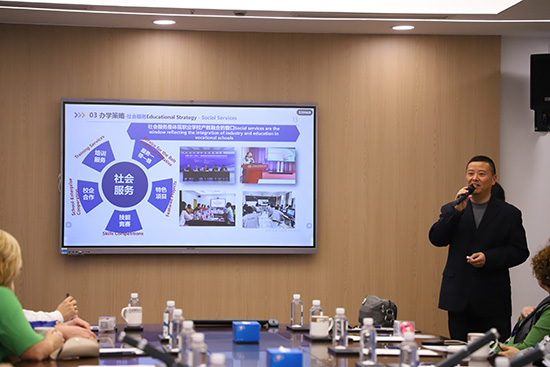 交流会上,张武剑校长热情欢迎来自波兰的教师团队,从学校的办学历史、办学宗旨、办学策略、专业建设、社会服务等方面介绍了学校的基本情况。