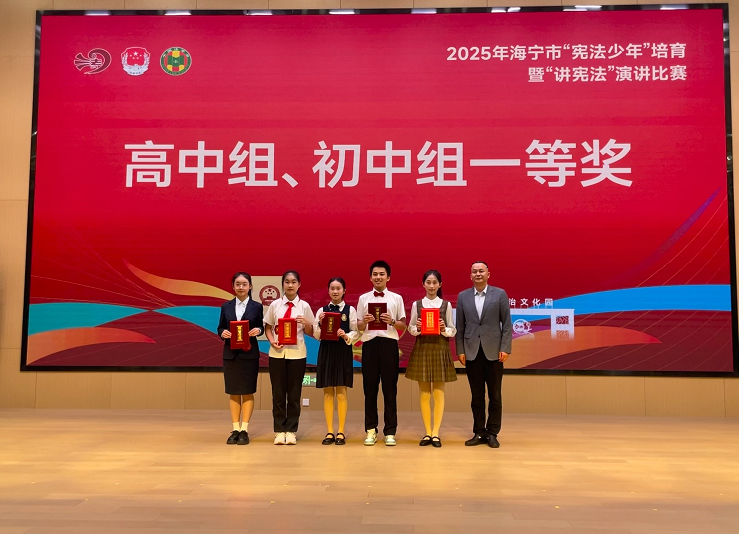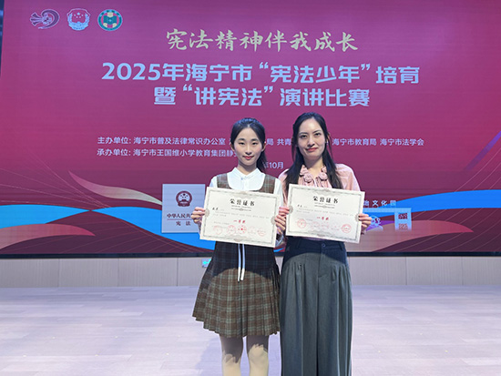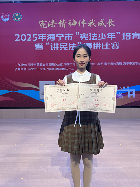 11月初接到知识素养竞赛通知,桑甚全力冲刺:通读《宪法》原文、梳理核心常识,每日加班加点筑牢知识防线。11月18日海昌初级中学考核现场,她沉着应答、精准破题,以优异成绩通过终考,跻身海宁市“宪法少年”行列。