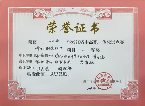 2025年12月5日,由浙江省教育厅主办的2025年浙江省中高职一体化试点赛增材制造技术项目在诸暨市实验职业技术学校顺利闭幕。最终,瑞安市塘下职业中等专业学校数控专业学生曾世俊(指导师:王克豪)与温州职业技术学院瑞安学院学生岑泉林(指导师:闵林锋)组成的团队,凭借扎实的专业功底和出色的实践能力荣获浙江省一等奖。这一亮眼成绩的取得,是瑞安市和温州职业技术学院长期深入合作的结晶,更是瑞安市塘下职业中等专业学校作为温州职业技术学院附属学校区域中高一体改革实践的生动写照。