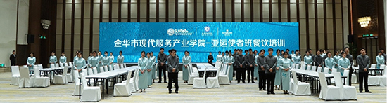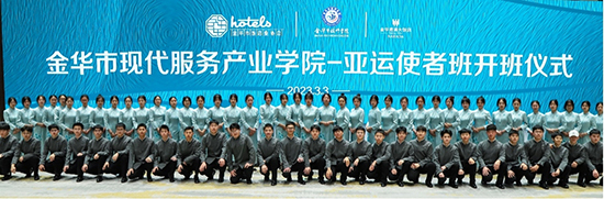 图片说明:2023年,学校抓住杭州亚运会举办的契机,金华市技师学院与合作企业金华市君澜大饭店共同推出现代服务专业群“亚运使者班”(亚运会结束后,该班名称改为“君澜使者班”),为学生创造高品质的真实实践的机会。