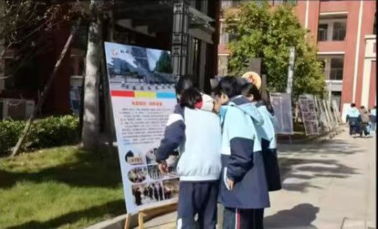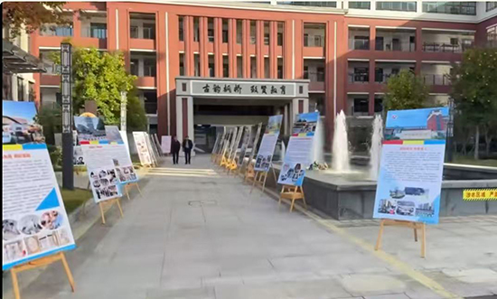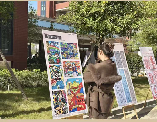 11月28日,诸暨市枫桥镇初级中学校园内,从校门通往报告厅的道路两侧展板林立、看点十足。53块精心布置的展板集中呈现了枫桥镇1所初级中学、3所小学及2所幼儿园的办学概况与书画特色成果,丰富的内容既吸引了全校师生驻足品鉴,更让前来参加诸暨市教科研经验推广现场会的与会教师们纷纷停步观赏、交流点赞。