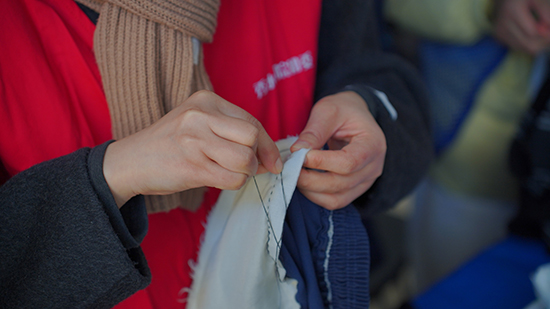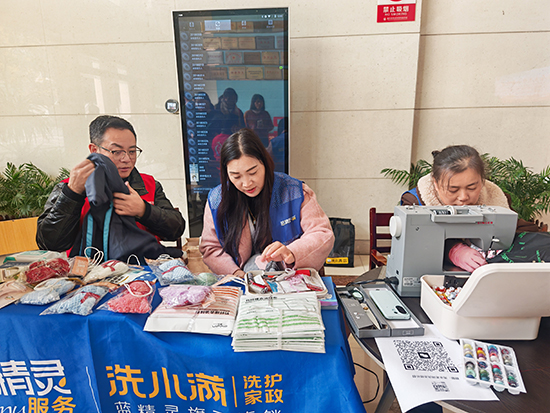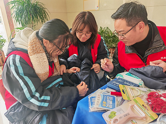 活动当日,服务站前师生络绎不绝。服装设计与工艺专业的学生在校企双师的共同指导下飞针走线,让一道道裂口悄然“愈合”,尽显扎实的技能功底;艺术设计与制作专业的学生全程跟进现场视觉维护,运用色彩与构图,传递冬日里的小温暖;还有贴心准备的小礼品,承载着心意与温度,被送到师生手中。
