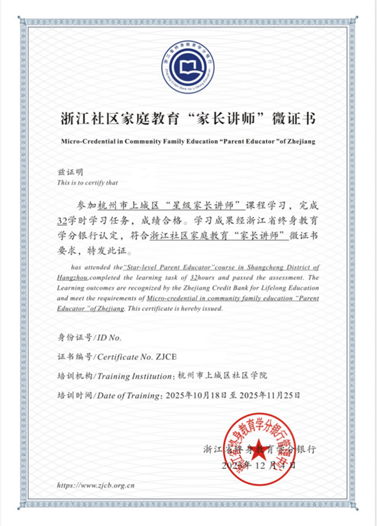 37张微证书不仅是家长成长的里程碑,更是引领和辐射区域家长终身学习的“第一粒星火”,从2017年的001号“星级家长执照”到今天的001号“家长讲师”终身学习微证书,上城用八年时间书写了家长教育的创新范本,实现从“执照”到“讲师”跨越式突破,推动上城家校社协同育人迈向更专业、更系统的新纪元。(上城区社区学院)