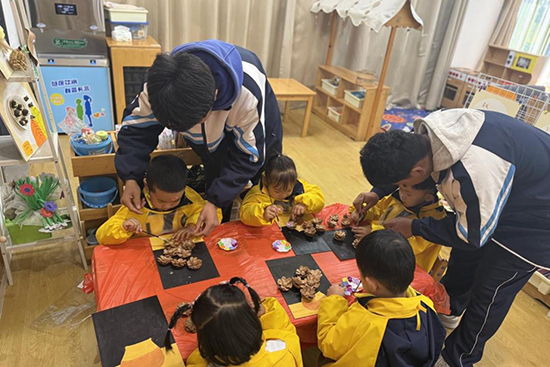 在五爱幼儿园中心园区,建筑专业的赵佳榕老师与同学们带来了一堂特别的“松果装饰课”。孩子们事先在校园、公园里收集来的松果,成为这节课最重要的“教具”。结合建筑室内装饰的设计思维,师生们引导幼儿将松果修剪、涂色,再拼贴在手绘小画板上。原本落地的松果,经过色彩点缀和创意布局,变成一幅幅独具自然美感的装饰画。课程不仅锻炼了幼儿的动手能力和色彩感知,也让“废物利用、创意生活”的美育理念悄然生根。