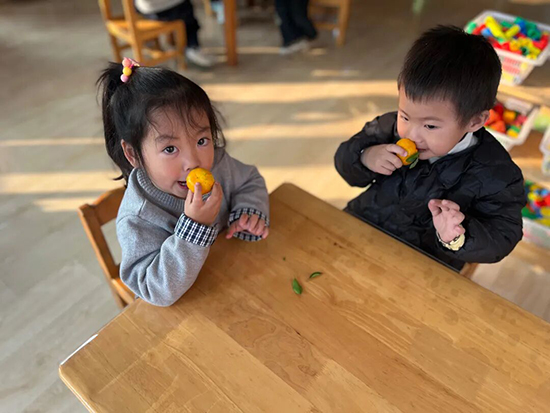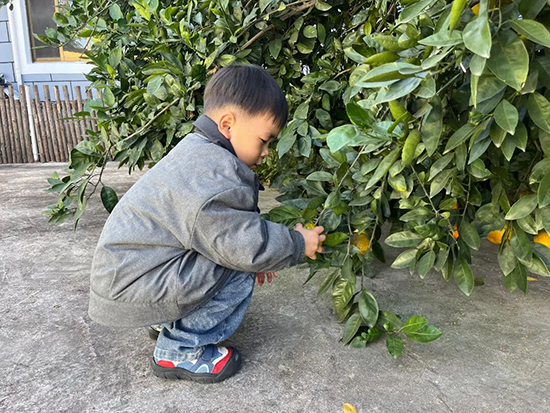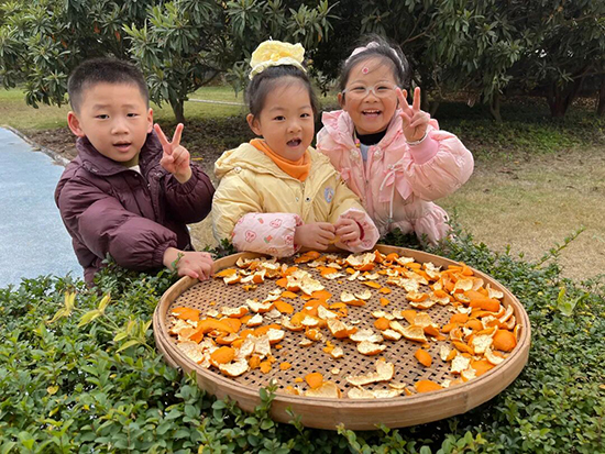 幼儿园的橘子林硕果累累,金黄的橘子挂满枝头。小班孩子们在老师的带领下,开启了欢乐的采摘之旅。他们穿梭在橘树丛中,仔细挑选着成熟的果实,小心翼翼地将一个个饱满的橘子摘下,不一会儿就收获了满满一篮。回到教室,孩子们围绕橘子展开探索:观察其圆润的外形、鲜亮的色泽,触摸果皮粗糙的质感;轻轻剥开橘子,聆听果皮裂开的“咔嚓”声,欣赏橘瓣紧密相拥的模样。品尝环节中,孩子们分享着酸酸甜甜的果肉,交流着味蕾的感受。随后,大家将橘子皮平铺在竹匾里,搬到阳光充足的户外晾晒。这场与橘子的亲密互动,不仅让孩子们体会到劳动的成就感,学会珍惜自然资源,更在冬日暖阳中收获了探索自然的快乐。