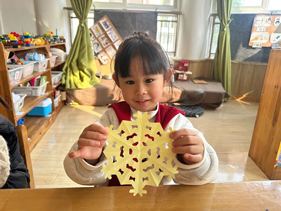 “大雪到,雪花飘。”中班孩子们化身小小艺术家,沉浸式投入雪花剪纸创作。他们充分发挥想象力与创造力,手持彩纸与剪刀,剪出了形态各异的雪花——有的形似闪烁的星星,有的宛如舒展的花瓣,有的层层叠叠错落有致。剪好后,孩子们互相展示、分享作品,教室里仿佛呈现出“雪花纷飞”的冬日盛景。剪纸过程中,孩子们的动手能力与审美素养得到提升,也对大雪节气的自然景象形成了直观而深刻的认知。