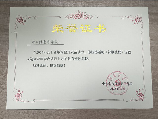 近日,安吉社区教育学院孝丰分院接连收获 4 份荣誉证书 —— 其《汉服礼仪》课程入选安吉县 “云上老年教育特色课程”,《汉韵两山涧》《我和我的祖国》《绿水青山安吉美》3 个节目同时跻身县级老年教育精品节目名单,成为安吉县老年教育领域的 “获奖大户”。
