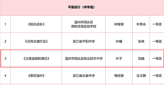 近日,2025年浙江省艺术节平面设计比赛(中学组)获奖名单公布,温州市洞头区职业技术中学23工美班学子叶子的开渔节主题作品《万尾金鳞跃满仓》凭借浓郁的海岛地域特色、鲜明的视觉艺术风格,从全省参赛作品中脱颖而出,斩获省一等奖!