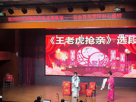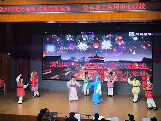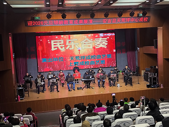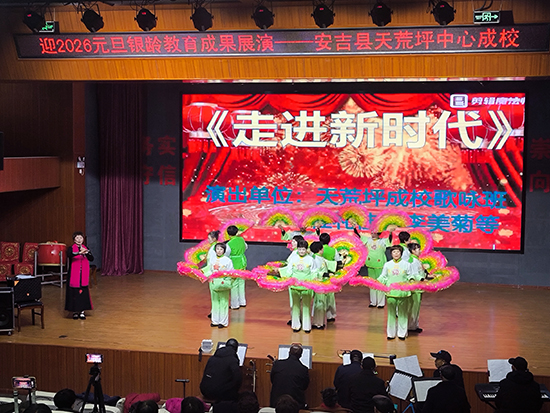 12月24日下午,安吉县天荒坪镇山河村文化礼堂内欢歌笑语、暖意融融,天荒坪中心成校“迎2026元旦银龄教育成果展演”在此精彩上演。天荒坪中心成校及下属上墅成校、山川成校的老年长班学员联袂献艺,近300名村民欢聚一堂,共赏这场充满银发活力的文化盛宴。