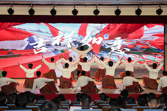 音乐情景剧《一张“涂鸦”的答案》通过涂鸦少年的成长故事,生动诠释了学校“以生为本、因材施教”的教育理念。历届校友带来的歌曲串烧《我的青春年华》满含对母校的眷恋与感恩。2007届毕业生、平湖市优秀民营企业家俞佳健作为校友代表登台分享校园回忆与创业心得,向母校送上真挚祝福。藏舞《吉祥如意》展现了学校对口支援四川省若尔盖县技能人才培养的丰硕成果,传递了东西协作、教育共富的使命担当。来自越南大南大学的师生带来歌曲《你来我往有情缘》,展现了多元文化交融的魅力,彰显了学校响应国家号召、推进“职教出海”的开放办学格局。