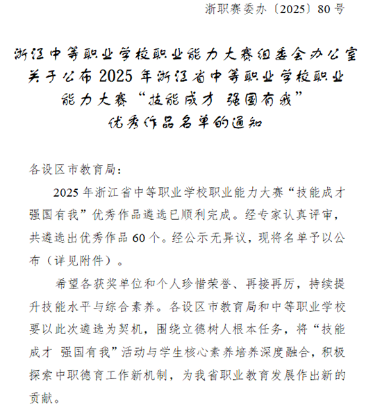 近日,浙江省教育厅公布2025年全省中等职业学校职业能力大赛“技能成才 强国有我”优秀作品名单,嘉兴市秀水中等专业学校报送的《春野诗笺:以自然诗境滋养中职生心灵韧性的实践探索》成功入选。