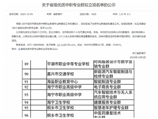 在国家大力推进职业教育高质量发展、强化职业教育与产业发展适配性的战略背景下,浙江省启动优质中职专业群遴选建设。近日,浙江省教育厅、浙江省财政厅公布优质中等职业教育专业群建设名单,海宁市职业高级中学电子商务专业群和汽车智能技术与无人系统应用专业群双双入选。此次立项既是对学校专业建设成果的认可,更是学校优化专业布局、提升育人质量、深化产教协同的重要契机,为两大专业群未来五年的高质量发展擘画了宏伟蓝图。