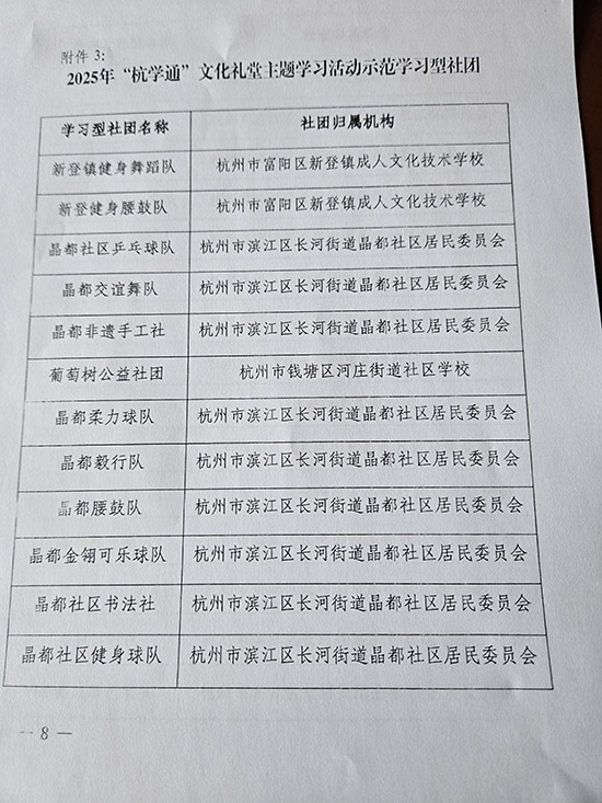 近日,根据《关于开展2025年“杭学通”文化礼堂主题学习活动的通知》(杭社大〔2025〕3号)文件要求,以杭学通平台数据为依据,评出2025年“杭学通”文化礼堂主题学习活动示范学习型社团30个,晶都社区交谊舞队、非遗手工社、柔力球队、腰鼓队、金翎可乐球队、社区书法队、健身球队、退大声乐队、晶之韵管乐乐队、晶都之韵舞蹈队、健身操队、康乐广场舞队、炫彩艺术队、靓晶晶形体社团等25个社团获评2025年“杭学通”文化礼堂主题学习活动示范学习型社团,占获奖总数的83.3%。