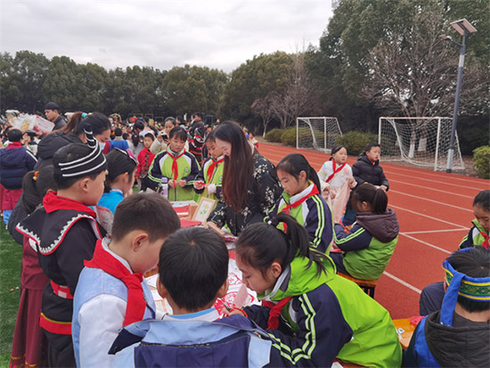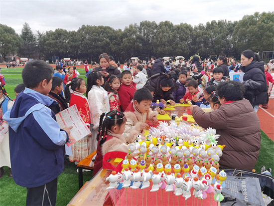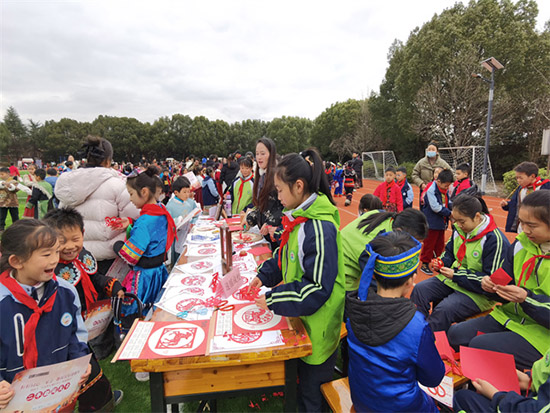 活动现场,学校邀请的非遗糖画、非遗剪纸、非遗葫芦画、非遗捏面人、非遗彩带编织、非遗竹编六位传承人早早摆好摊位,琳琅满目的非遗作品与制作材料瞬间吸引了孩子们的目光。糖画摊位前,传承人手持熬煮好的糖稀,手腕翻飞间,龙、凤、小兔子等栩栩如生的图案便跃然石板之上,金黄剔透的糖画引得孩子们连连惊叹;剪纸摊位上,红纸在传承人手中翻转折叠,剪刀开合间,一幅幅寓意吉祥的窗花、一张张造型别致的民族纹样剪纸新鲜出炉,孩子们迫不及待地拿起剪刀,跟着传承人学习创作;葫芦画摊位前,传承人以细腻笔触在葫芦上勾勒民族风情图案,色彩斑斓的葫芦让孩子们感受到传统工艺的精妙;捏面人摊位更是人气爆棚,面团在传承人手中几经捏、搓、揉、掀,转瞬就变成憨态可掬的生肖形象、灵动可爱的民族娃娃;彩带编织摊位上,五彩斑斓的彩带在指尖穿梭,变成精美的手环、挂饰,承载着孩子们对新年的美好期许;竹编摊位前,安吉本地特色的竹丝在传承人手中编织成小巧的竹篮、竹扇,让孩子们近距离领略本土非遗的独特魅力。