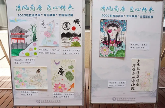 立足中职教育特点,学校推动党建工作与专业建设、文化传承、家校协同深度融合,让清廉建设更具生命力。党建+专业融廉,发挥各专业优势创新廉洁教育形式,会计专业强化“诚信为本,不做假账”职业教育,平面设计专业打造清廉IP形象“规规”“矩矩”,烹饪专业研发“廉洁菜品”菜单,旅游专业制作清廉微视频《职教有廉·细微之处见修行》,非遗课程中师生共同创作清廉主题盘扣、泥塑等作品,以专业技艺传承廉洁理念。党建 +文化浸润,优化校园廉洁环境建设,打造党建清廉长廊、教学清廉长廊、劳动教育基地等特色阵地,在图书馆设置廉洁文化书架,通过电子屏、班牌等媒介常态化宣传廉洁故事,让校园处处见“廉”影。党建+家校联动,建立校级廉洁教育中心、社区廉洁驿站、家庭廉洁微基地三级联动机制,开展清廉小报展、清廉家训展、清廉进社区等活动,形成“学校传廉、家庭守廉、社区践廉”的良性互动格局。