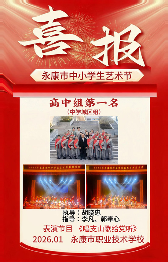 近日,永康市中小学生艺术节比赛圆满落幕。永康市职业技术学校“星河舞蹈团”凭借精心创排的作品《唱支山歌给党听》,以深刻的思想内涵与精湛的艺术表现,在众多参赛队伍中脱颖而出,荣获城区舞蹈中学组一等奖(高中组第一名)。此项荣誉是该校在艺术教育领域的一次历史性突破,对推动学校美育发展具有深远意义。