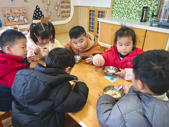 “搓一搓,揉一揉,小小汤圆圆溜溜”。小班的孩子们化身“小小美食家”,在老师的悉心指导下,认真学习搓、揉、捏面团的技巧。糯软的糯米团在一双双小手中几经翻转,很快就变成了一颗颗憨态可掬的汤圆,整齐地码放在竹匾中。待水烧开,老师将汤圆下锅,再加入打散的蛋液与枸杞同煮,一碗碗香甜软糯的汤圆便新鲜出炉。孩子们不仅体验了动手制作的乐趣,更在分享美食的过程中,体会到冬至吃汤圆寓意团圆的温暖氛围,甜蜜的滋味在舌尖萦绕,也在心底留存。
