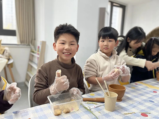 当冬至与传统美食相遇,会碰撞出怎样的火花?12月20日,孩子们首先通过双语绘本了解冬至的由来与习俗,随后亲自上阵体验手打糍粑的乐趣。捶打、揉捏、塑形……糯米的香气弥漫在活动室,孩子们在亲手制作传统美食的过程中,不仅感受到了劳动的乐趣,更深刻理解了节气背后的文化内涵。