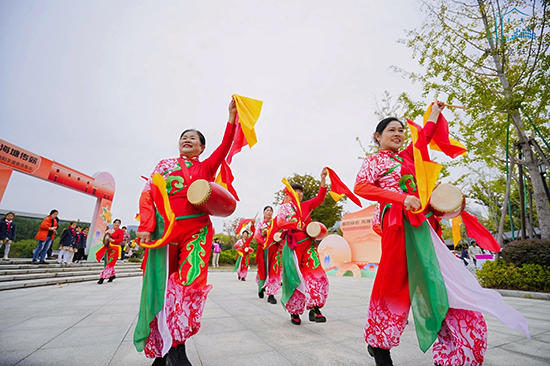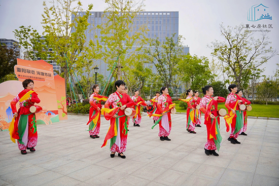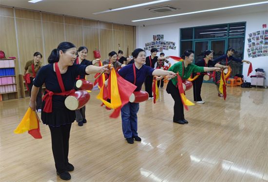 另一边的腰鼓班则是一派热闹欢腾的景象。鼓槌起落,红绸翻飞,学员们身着统一服装,踏着整齐的步伐,敲出铿锵有力的节奏。腰鼓讲究“身随鼓动,鼓随人鸣”,从基本的鼓点节拍,到复杂的队形变换,老人们顶着烈日反复练习,汗水浸湿了衣衫,却浇不灭心中的热情。结业展演中,激昂的鼓点响彻社区,豪迈的姿态尽显活力,展现出新时代老年人昂扬向上的精神风貌。