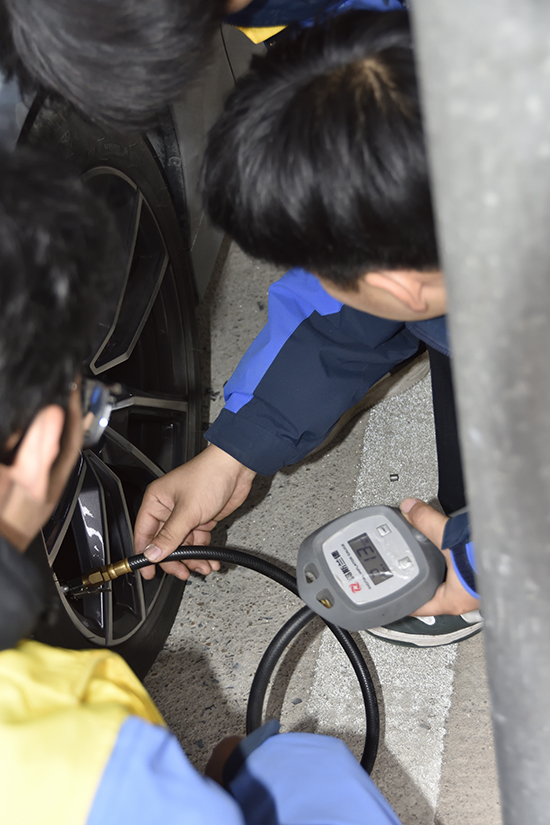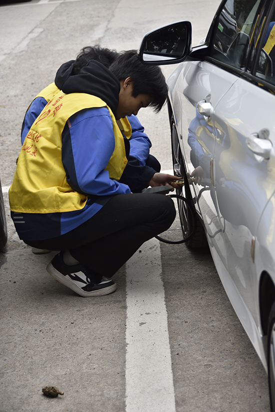 服务项目紧紧围绕冬季行车常见隐患展开,涵盖轮胎安全检测、玻璃水检查与添加、雨刮器基础检查等实用内容。学生们使用专业胎压检测仪,认真比对每辆车的标准胎压值,并为胎压不足的轮胎进行免费补气;同时仔细检查轮胎磨损情况,提示潜在风险。在玻璃水添加与雨刮器检查环节,学生不仅完成基础服务,还主动向车主讲解冬季保养知识与注意事项,体现出良好的专业素养与服务意识。