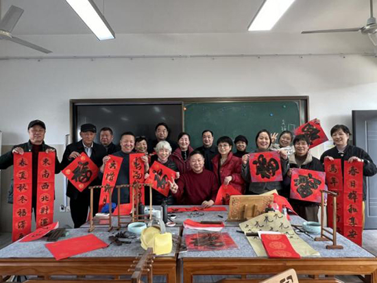 课程结束,暖阳正好。学员们手持自己写的春联和福字,来到校园空地上拍大合照。红纸在阳光下愈发鲜艳,映照着每一张灿烂的笑脸。快门轻响,定格的不只是一张合照,更是这个午后,一群因笔墨结缘的人共同分享的温暖与喜悦。