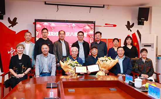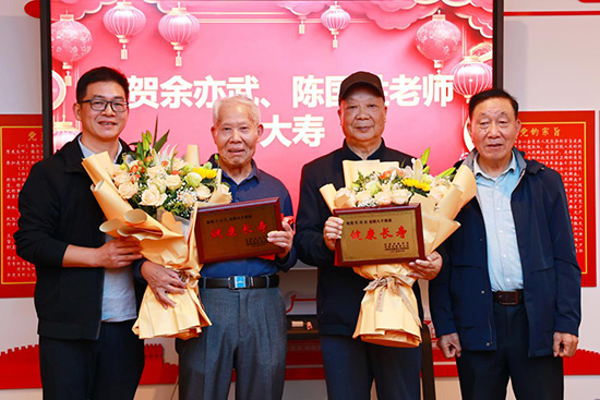 本次活动还为学校退休教师余亦武、陈国胜两位老师举办了80岁大寿庆祝活动,侯浩乐专职副书记代表学校致祝寿词,并由杨会长和陈校长颁发了学校特定的鲜花和牌匾。