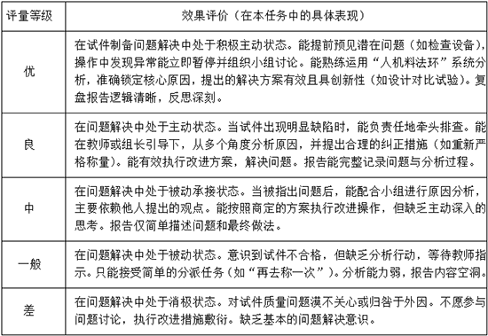 3.拓展层:能够熟练、精准地完成操作,起到小组骨干作用。能主动发现潜在问题(如搅拌机转速异常声响),并初步判断。能系统性地运用“人机料法环”框架领导小组进行问题根因分析,设计验证小实验(如对比不同振实次数的试件断面),并总结出预防此类问题再次发生的操作要点。
