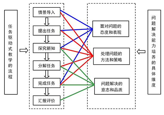 本案例将问题解决能力划分为“面对问题的态度”“处理问题的方法和策略”“问题解决的态度”三个维度。为了使任务驱动式教学更能准确改善学生问题解决能力的不足、培养学生的问题解决能力,本案例中任务驱动式教学的每个环节都指向学生问题解决能力的具体维度,从面对问题的态度、处理问题的方法和策略、问题解决的品质上培养学生的问题解决能力。
