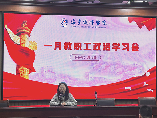 为深入学习贯彻国家重要精神,加速推进教育数字化转型,2026年1月16日,海宁技师学院召开了1月全体教职工政治学习会。会议由副校长王立群主持,全体教职工齐聚一堂,在政策学习与技术赋能的深度融合中,凝聚起推动技工教育高质量发展的奋进力量。