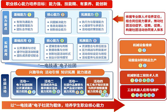 1.能力建构目标:构建以社团活动和展示为载体的职业核心能力培养路径,通过社团招新、作品展示、产品展销、知识竞赛、教学比赛等活动,系统性提升学生的沟通合作、信息处理、创新解难、自我管理及自主学习等关键能力。
