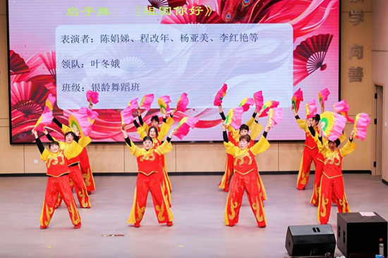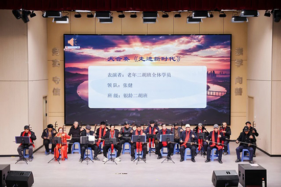 演出在大合奏《走进新时代》中落幕。整场演出涵盖腰鼓、二胡、舞蹈、瑜伽、独唱等形式,3个班级、2支艺术团的百余位学员参与,践行“老有所学、老有所乐、老有所为”理念。