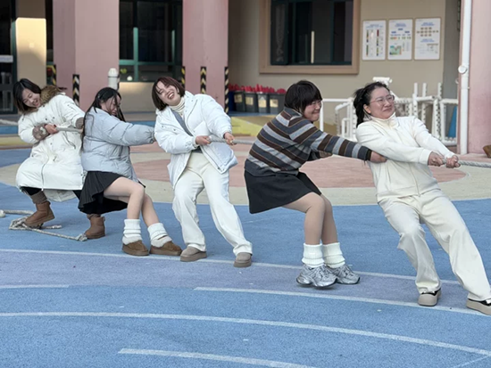 团体超级障碍赛更是考验协作与勇气的舞台。大班“同心协力”接力赛紧张激烈,孩子们在滑轮、跳马、滚筒、单杠等关卡中默契配合、勇往直前;中班“狭路相逢”趣味十足,套圈、越障、运球、投掷等任务全方位考验着萌娃的智慧与敏捷;小班“宝贝向前冲”环节,孩子们走平衡木、跳敏捷梯、钻障碍、投球入框,稚拙却认真的模样赢得全场阵阵掌声。教师组“力拔山河”拔河比赛同样精彩,三个年段的教师们紧握长绳、齐心协力、奋力拼搏,在震天的呐喊声中展现了强大的团队凝聚力与青春活力。